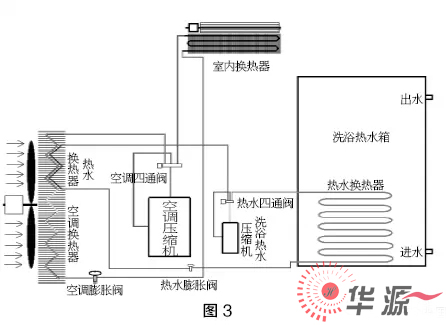 熱泵三聯(lián)供系統(tǒng),概念新穎,所謂空調(diào)模式運(yùn)行時(shí)可以加熱洗浴熱水,購買一套三聯(lián)供設(shè)備,可以實(shí)現(xiàn)室內(nèi)制冷、供暖及洗浴熱水??梢越档筒糠殖跬顿Y,但運(yùn)行費(fèi)用與空調(diào)加空氣源熱泵熱水機(jī)的運(yùn)行費(fèi)用是相同的。如下圖2所示:
